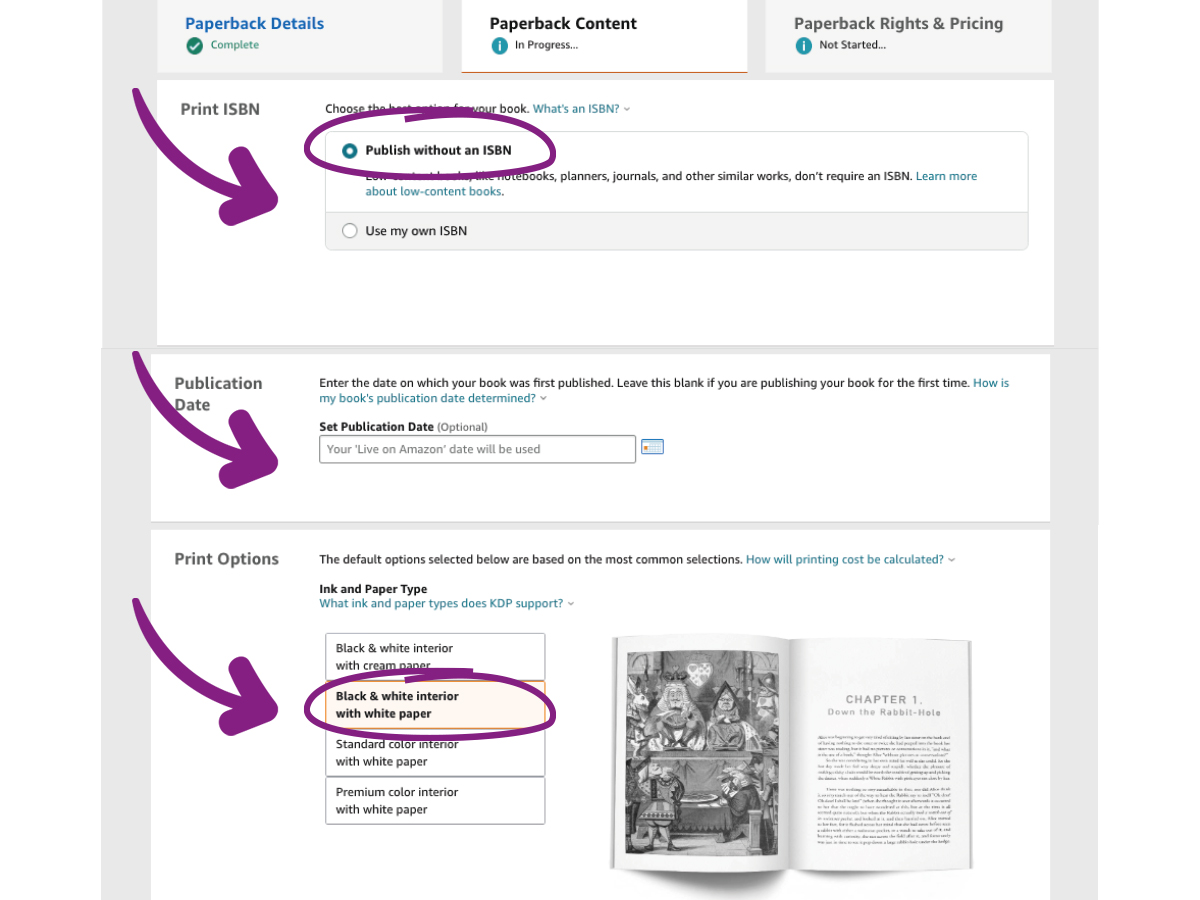 Here you can select Publish Without ISBN as this is not needed for a low content book.