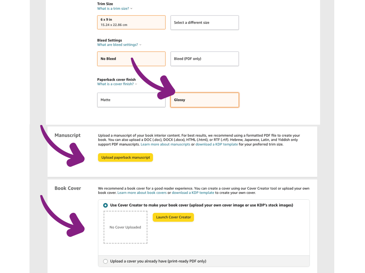 You select bleed or no bleed. Most simple low content books will have no bleed because you will have kept everything within the “safe print area” margins when creating your content manuscript.