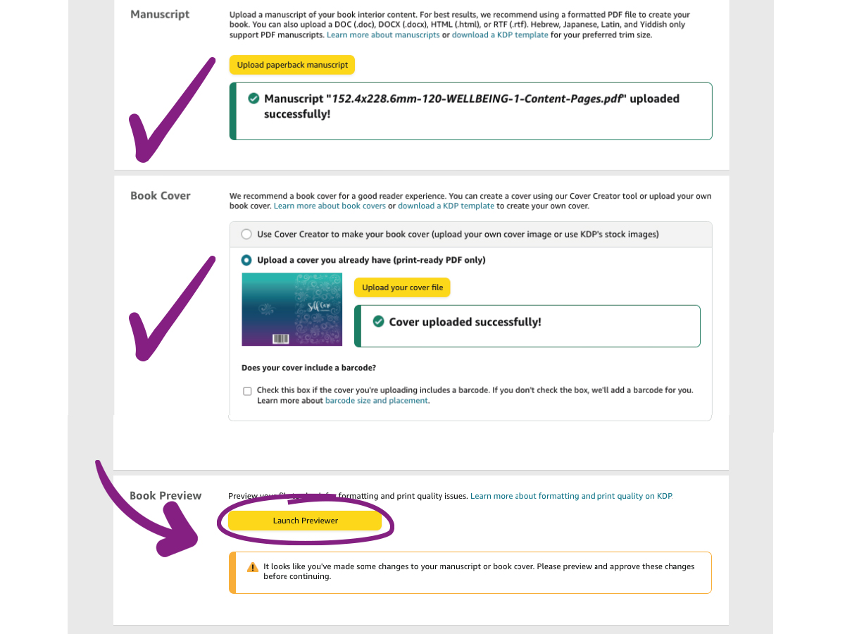 Once you have successfully uploaded your Manuscript PDF file and then your Cover Pdf file, the “Launch Previewer” button will become clickable and you can open up the preview and quality check web page.