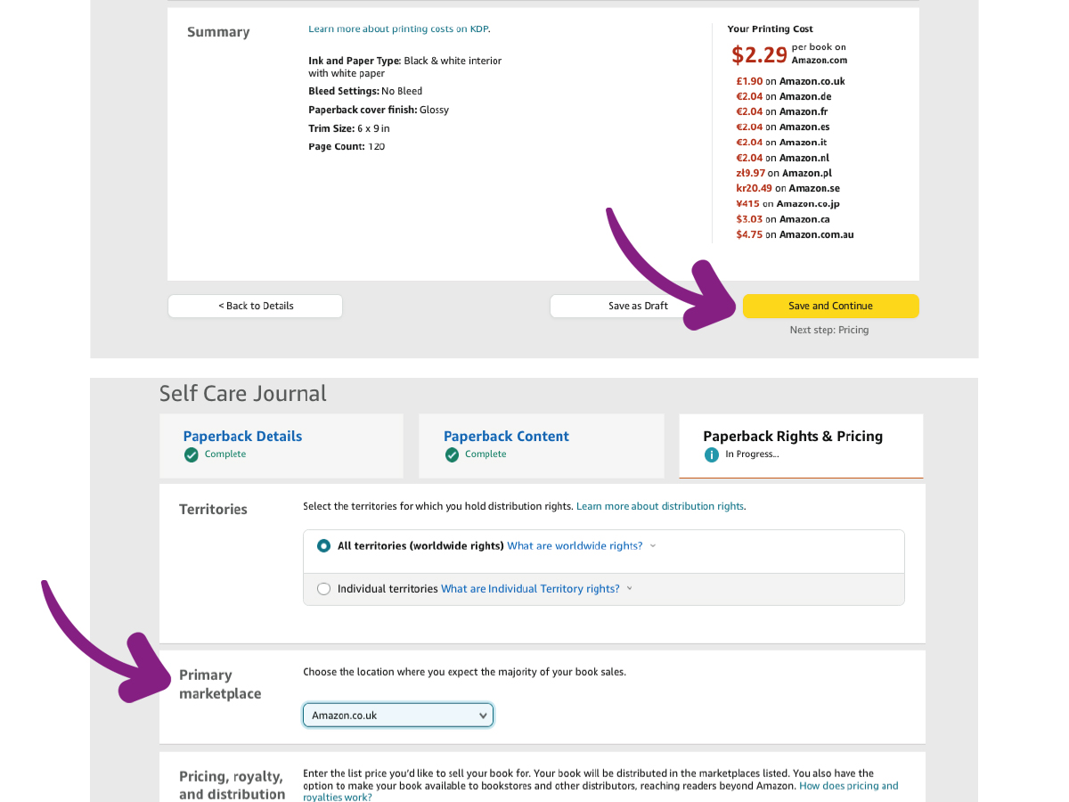 Choose your Primary Amazon site (which reflects the country your are based in and your currency) and then input the amount you want to sell your book for. This amount must be a certain percentage above the cost of printing your book as detailed.