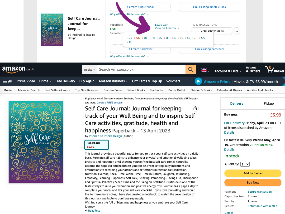 If you take your cursor over where it says “View on Amazon” it will give you a dropdown menu where you can pick out the country you want to see your Live Amazon listing for. Click on that and it will take you to your Sales Page for your book. This is how you can find the link to go ahead and promote and sell your book.