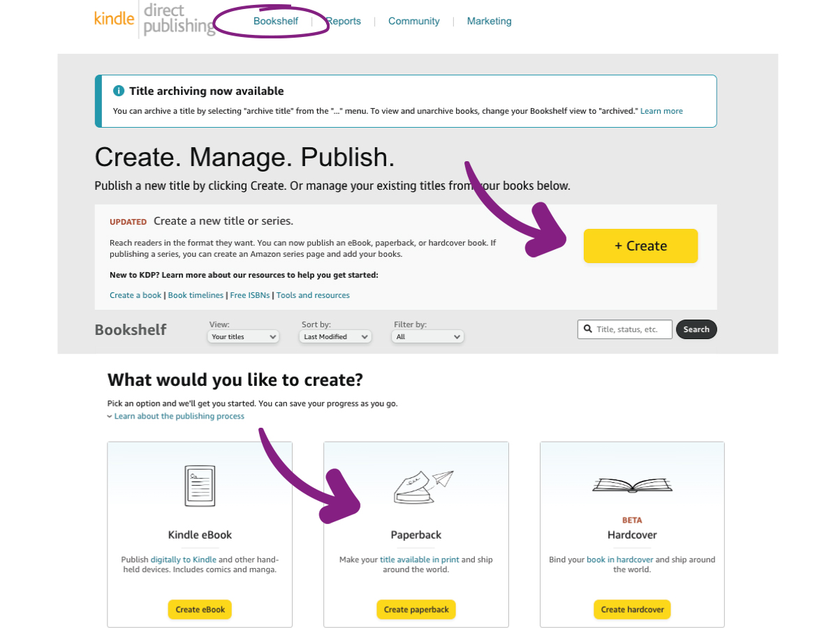 Log in to your Amazon KDP account and go to your “Bookshelf” as shown on the image. You can then select and click on the “Create” button.