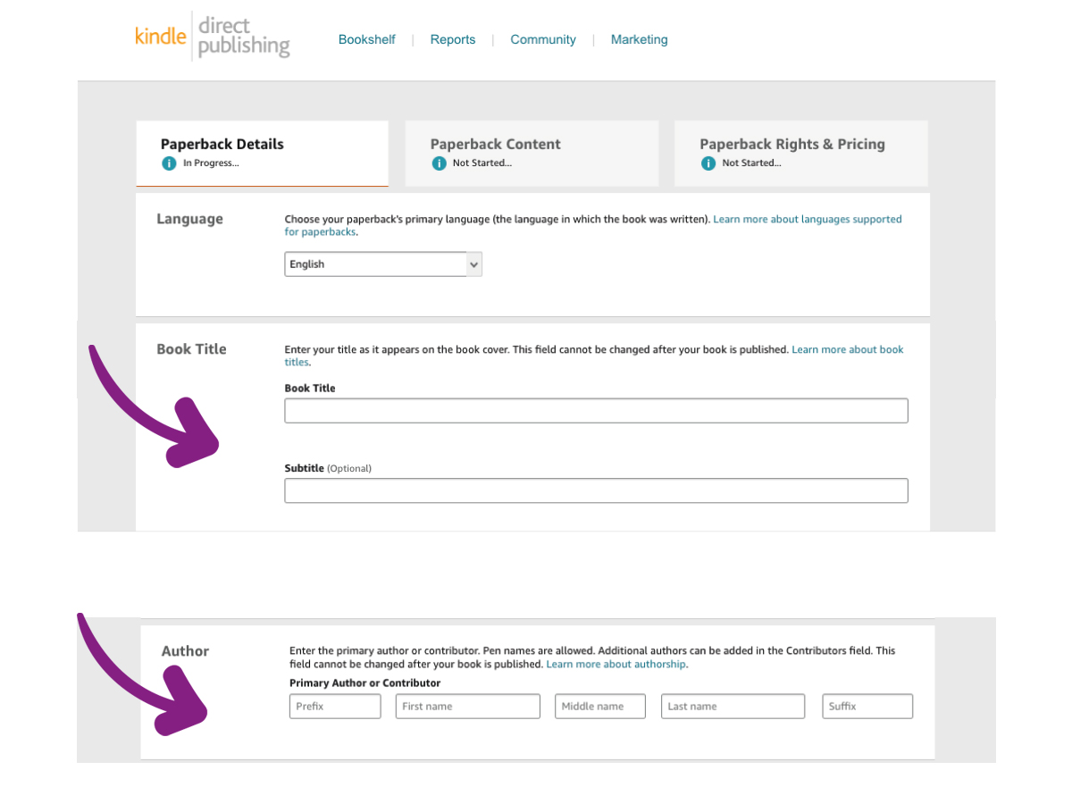Next you will input the Author Name you wish to publish under. This can be your actual name, a pseudonym or even your business name or a name you have made up to publish your books under. Just make sure you have copyright of the name you use. The author name can, but does not ‘need to’ appear on the book cover.