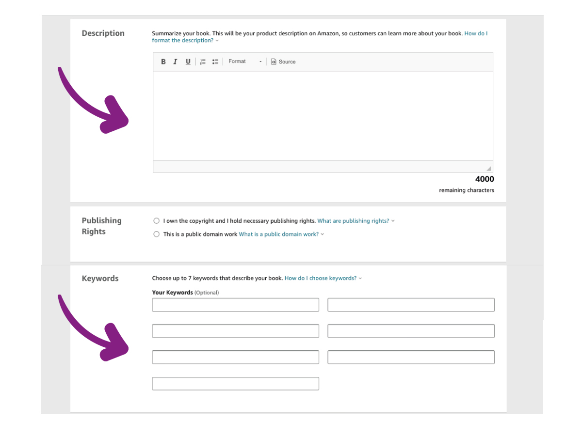 Now is your opportunity to create a comprehensive description of your book to go with your listing on Amazon. This should cover: