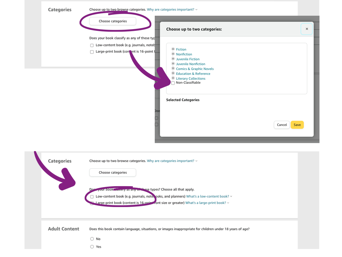For a low content book such as a Notebook, Journal or Planner, click on the “Categories” tab and choose “Non-Classifiable” from the pop up box options.